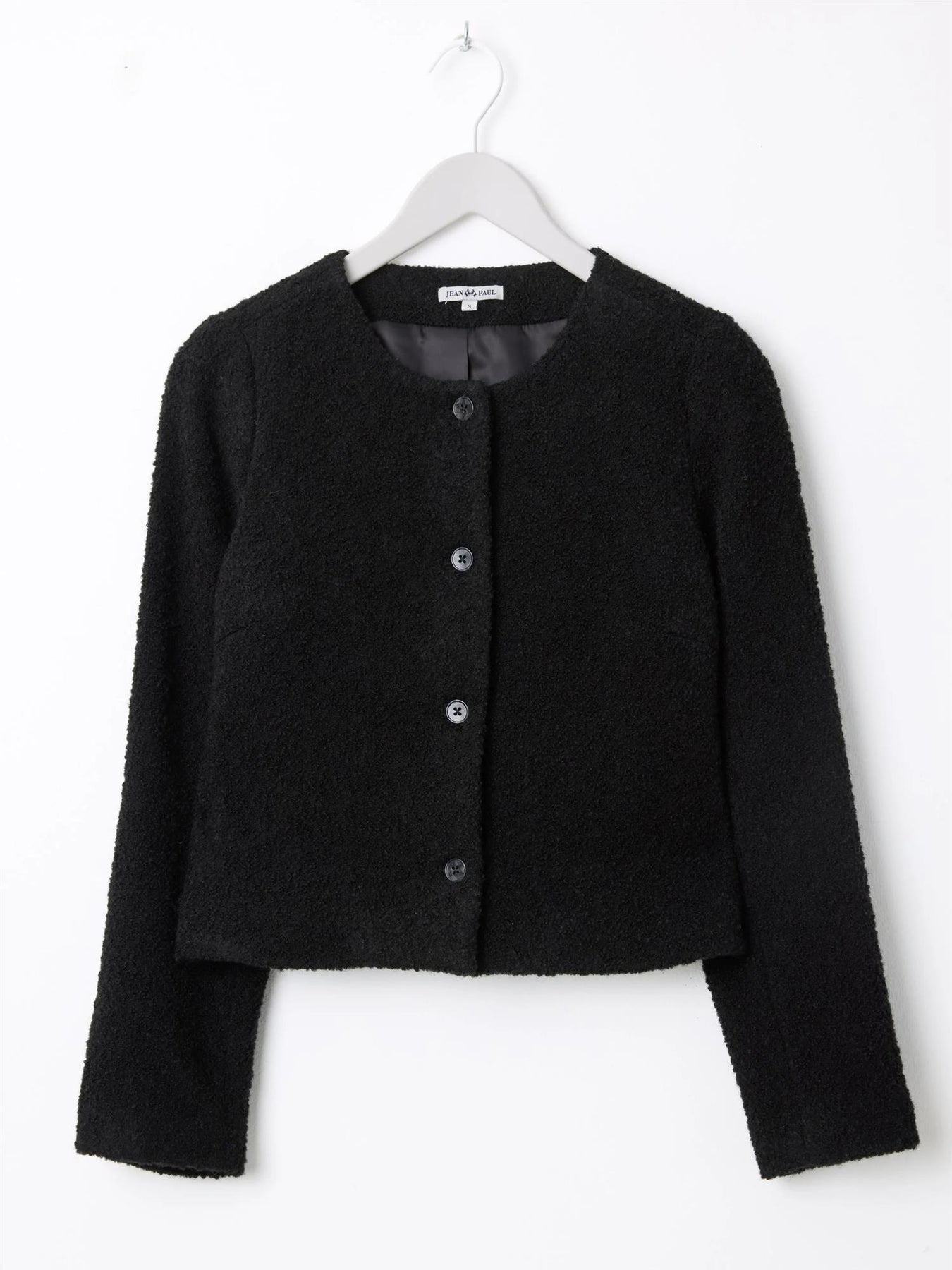 Elegant blazer fra Jean Paul. Blazeren har en kort, feminin passform, rund halsåpning, ton-i-ton knapper og rette ermer med knappdetaljer. Passer like fint til en bukse i hverdagen som til et skjørt for en mer elegant look.
