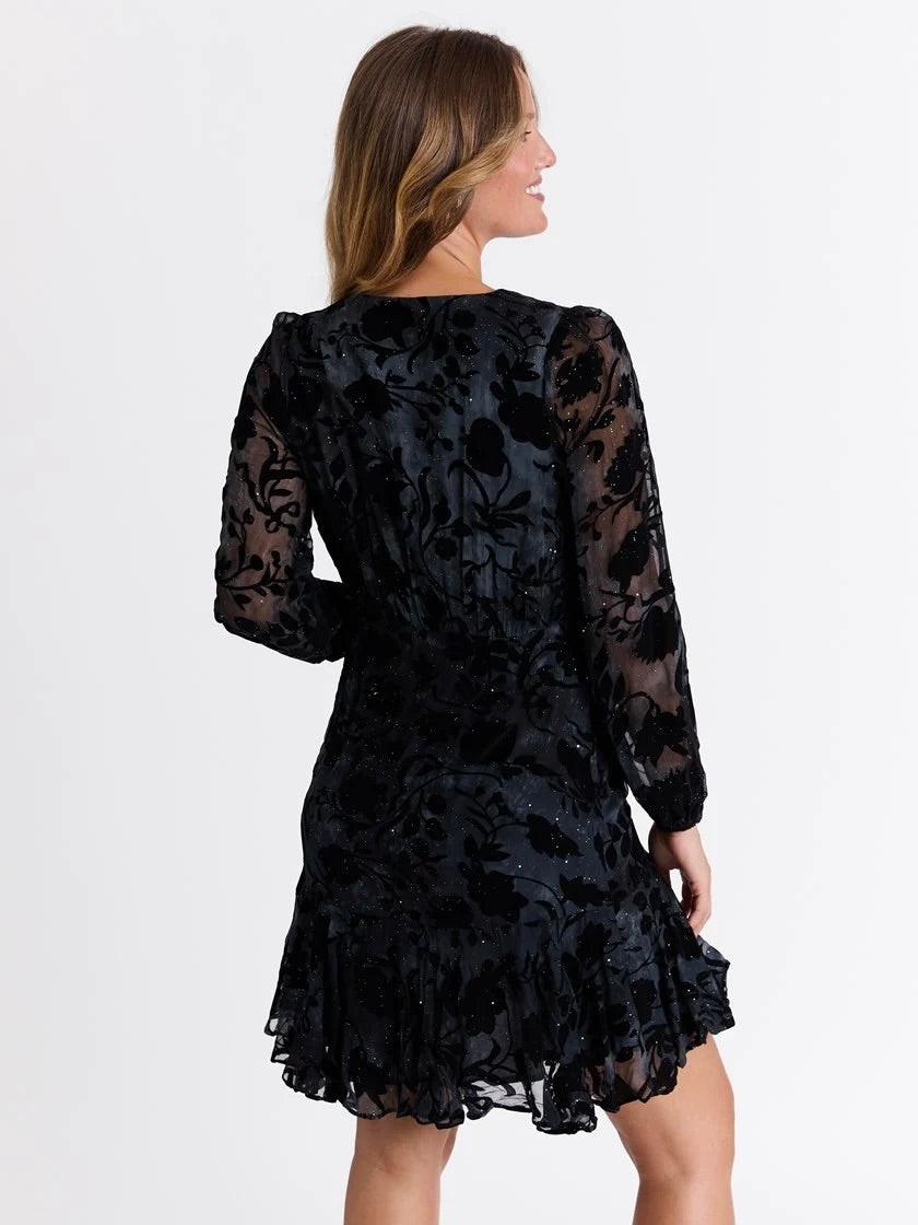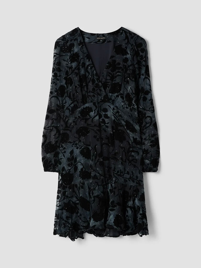 Feminin kjole med fløyelsprint og glitrende detaljer. Kjolen har v-utringing, lange ermer med strikk nederst og utskrådd skjørt med høy kappe. Fôret kropp og glidelås i siden gir komfort og perfekt passform.
