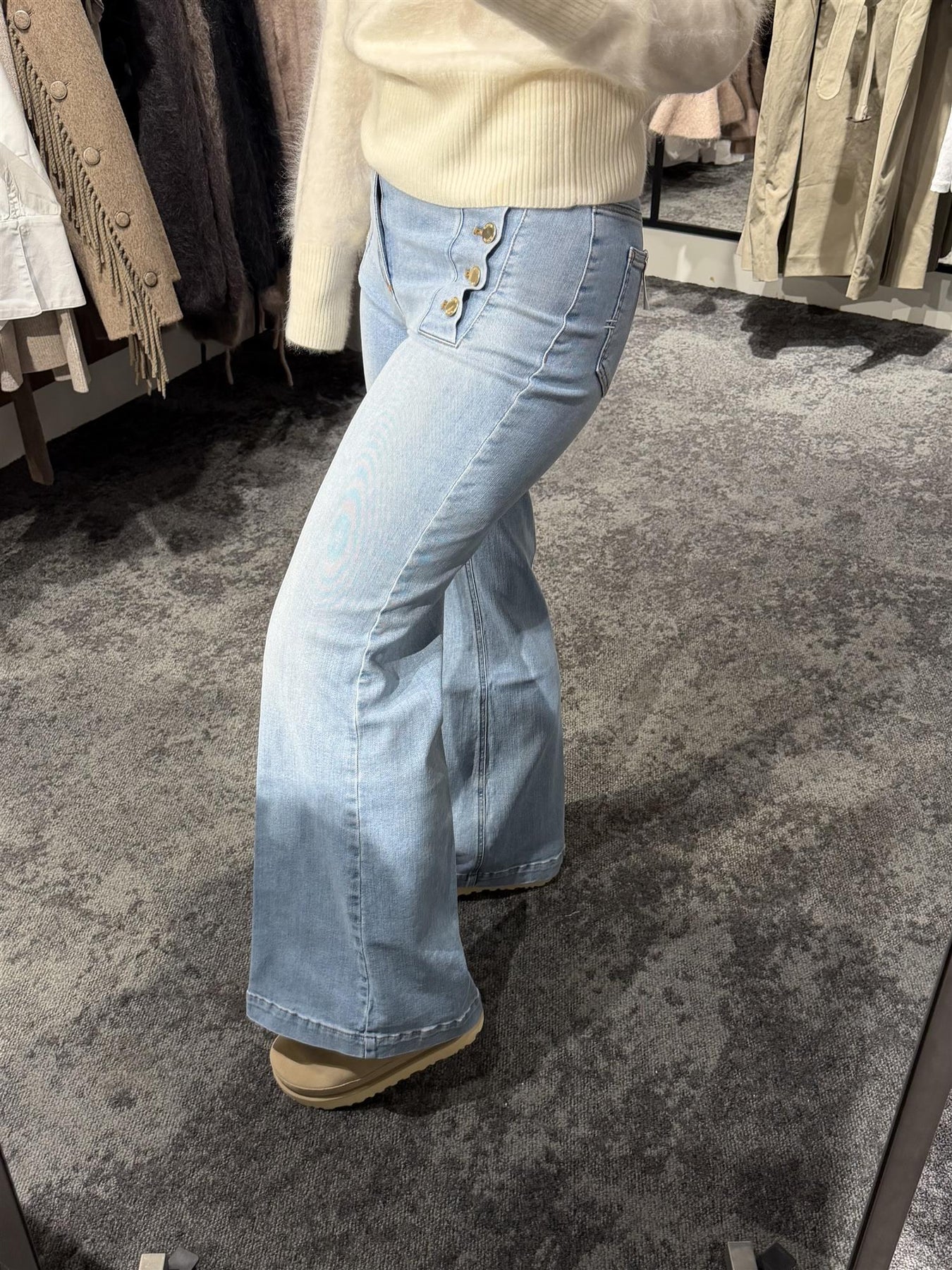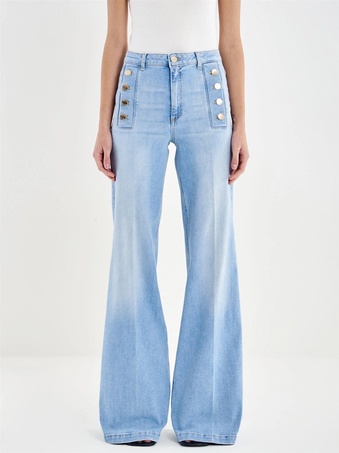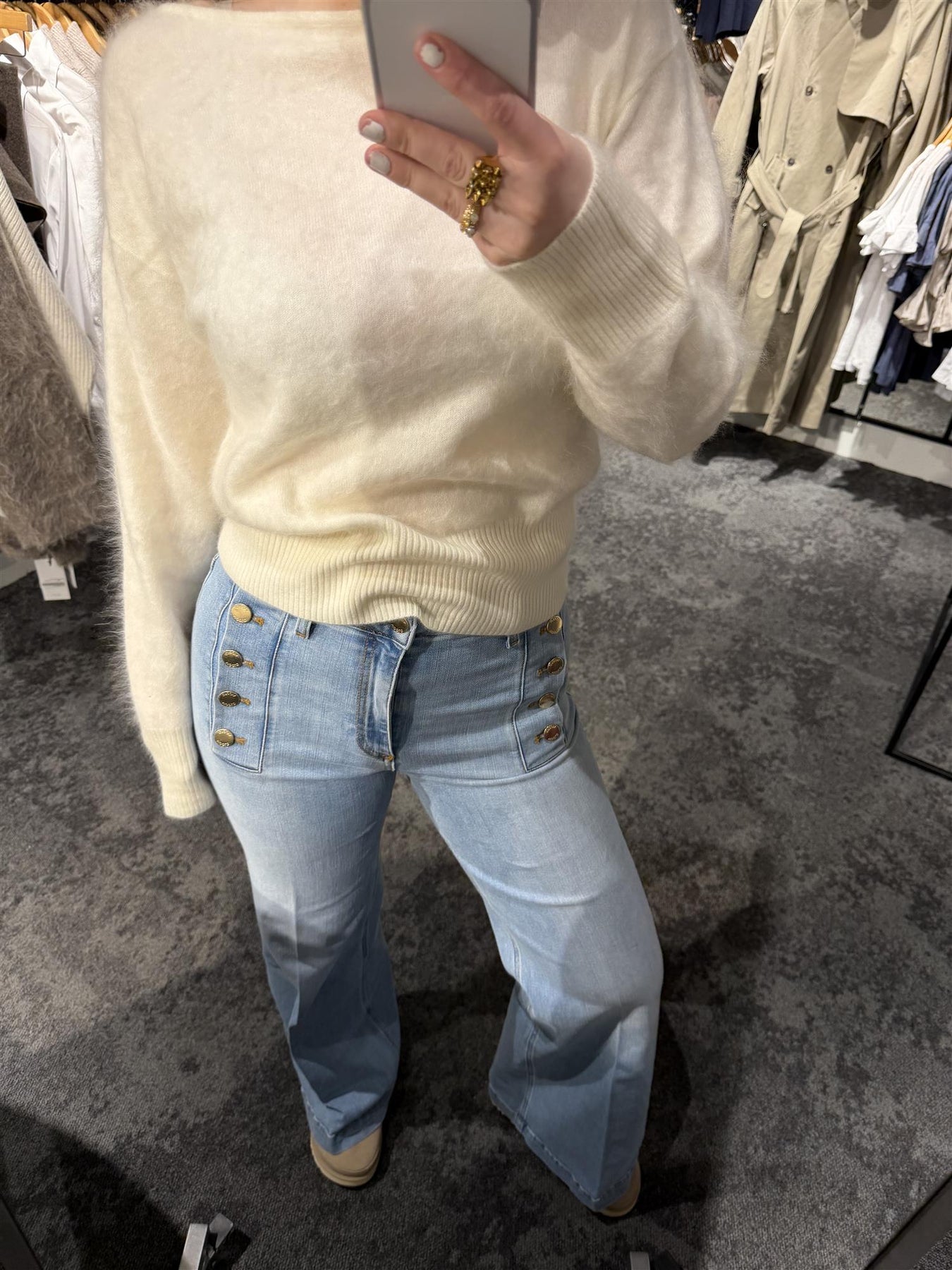 Giudith er en vid jeans fra Vicolo! Elegant denimjeans som har høyt liv, vid passform og dekorative gullknapper. Jeansen kan styles både opp og ned, kombiner den gjerne med en enkel topp for en avslappet look, eller med en blazer for en mer sofistikert look. Normal i størrelsen.