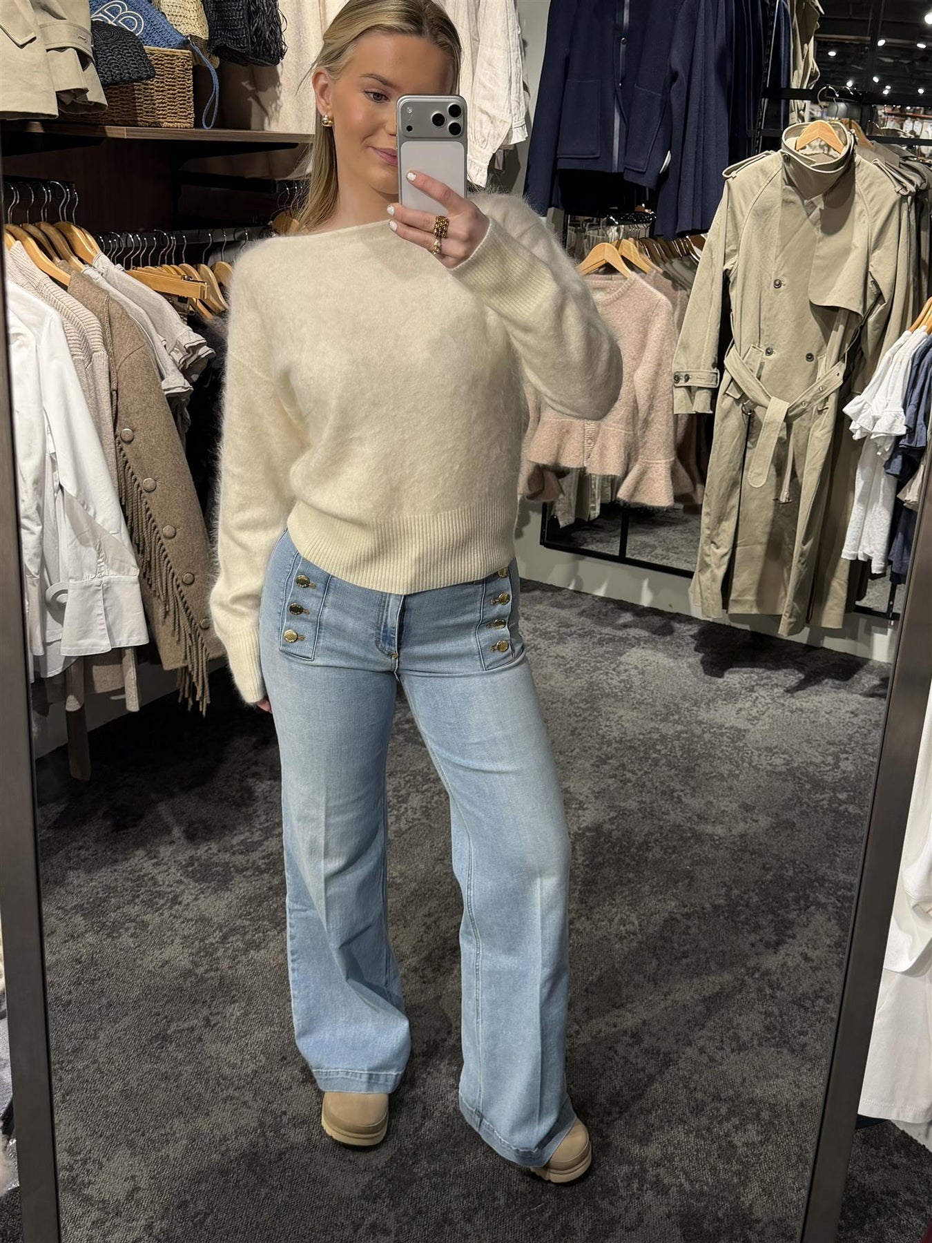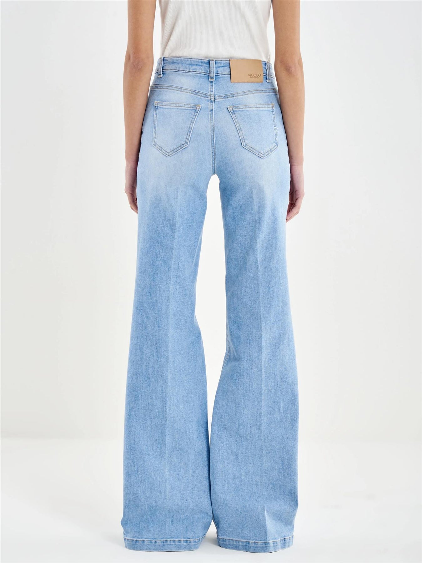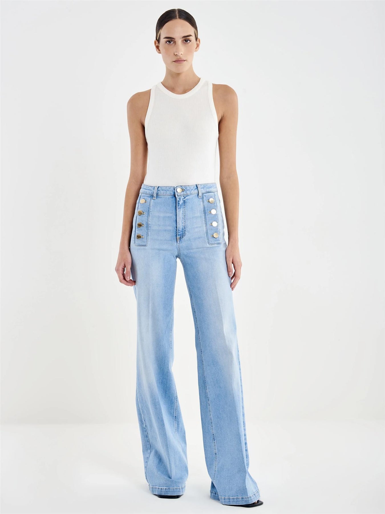 Giudith er en vid jeans fra Vicolo! Elegant denimjeans som har høyt liv, vid passform og dekorative gullknapper. Jeansen kan styles både opp og ned, kombiner den gjerne med en enkel topp for en avslappet look, eller med en blazer for en mer sofistikert look. Normal i størrelsen.
