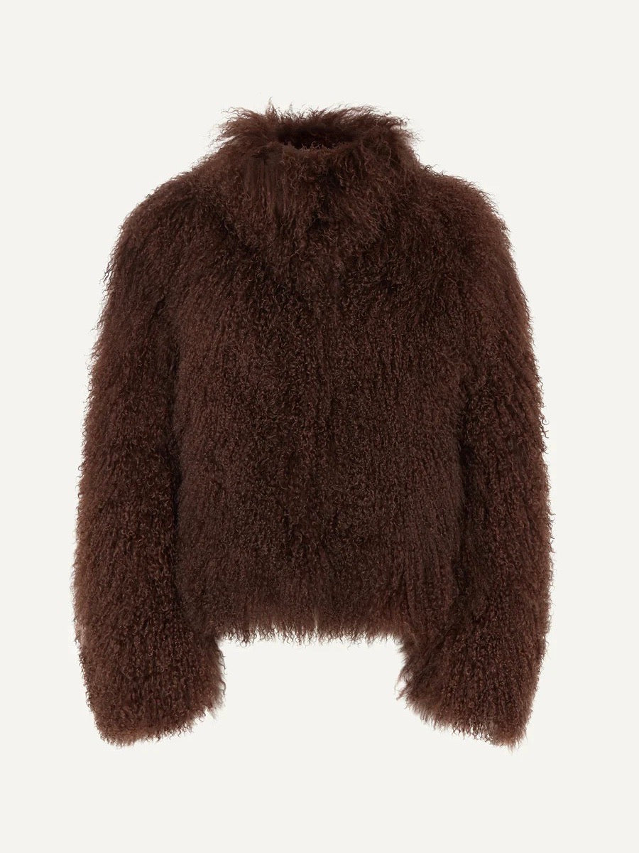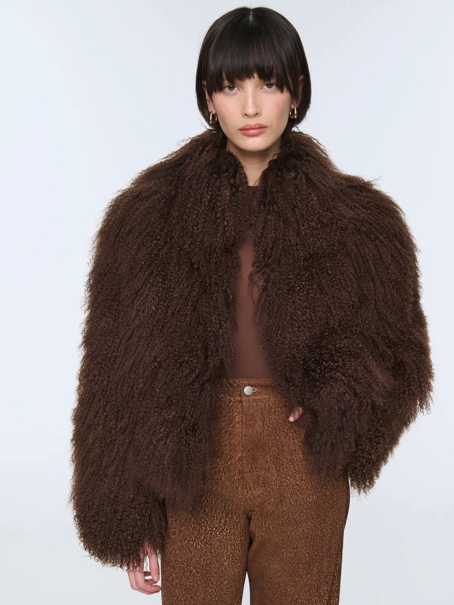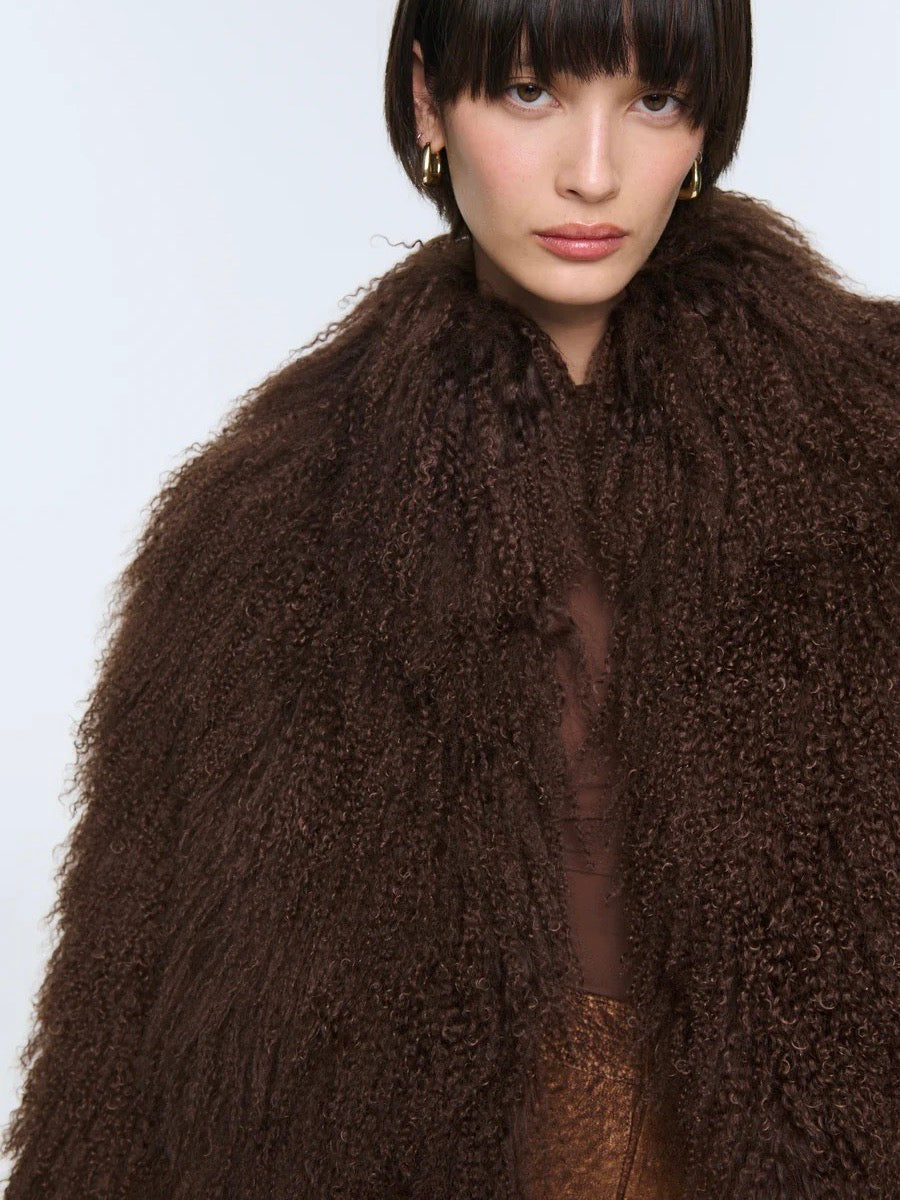 Kåpen er laget av det mest luksuriøse mongolske saueskinnet, gjør et inntrykk uansett hvor den er. Den naturlige, krøllete finishen og de diskret skjulte lukningene gir plagget et både stilig og komfortabelt preg.