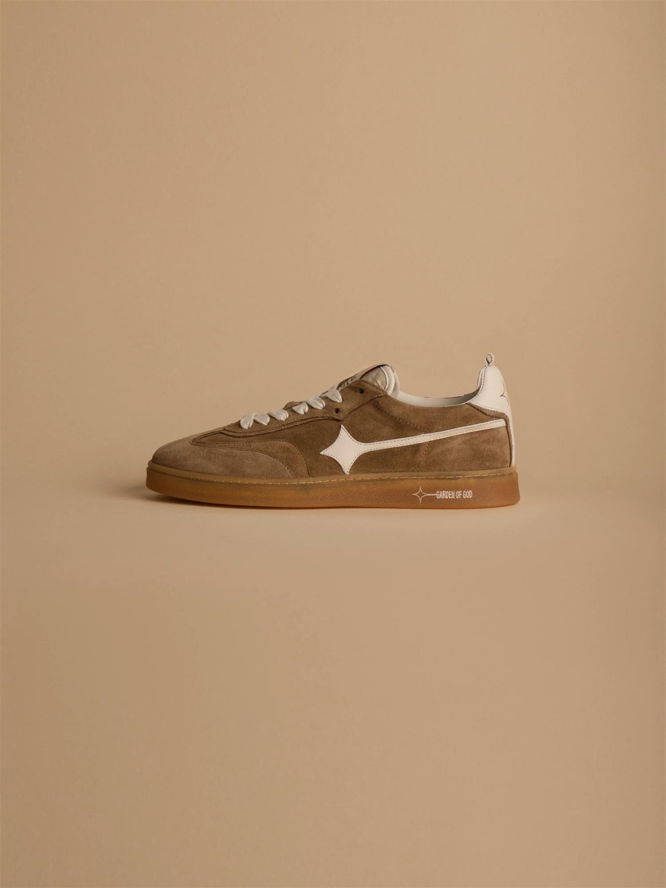 Stilig nyhet fra Garden of God. Denne kule skoen i dark beige semsket skinn kombinerer retrodesign med moderne detaljer og høy komfort. Skoen har off white logo, skinndetaljer og to par med lisser i ulik farge.