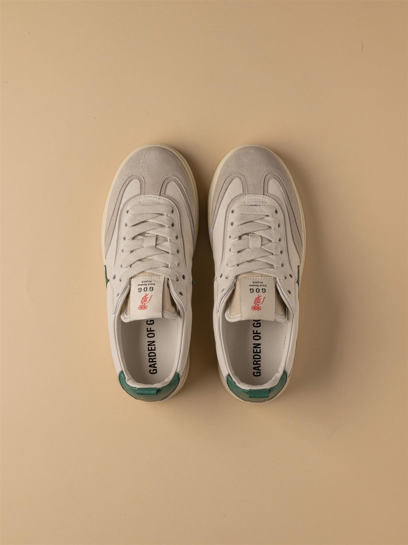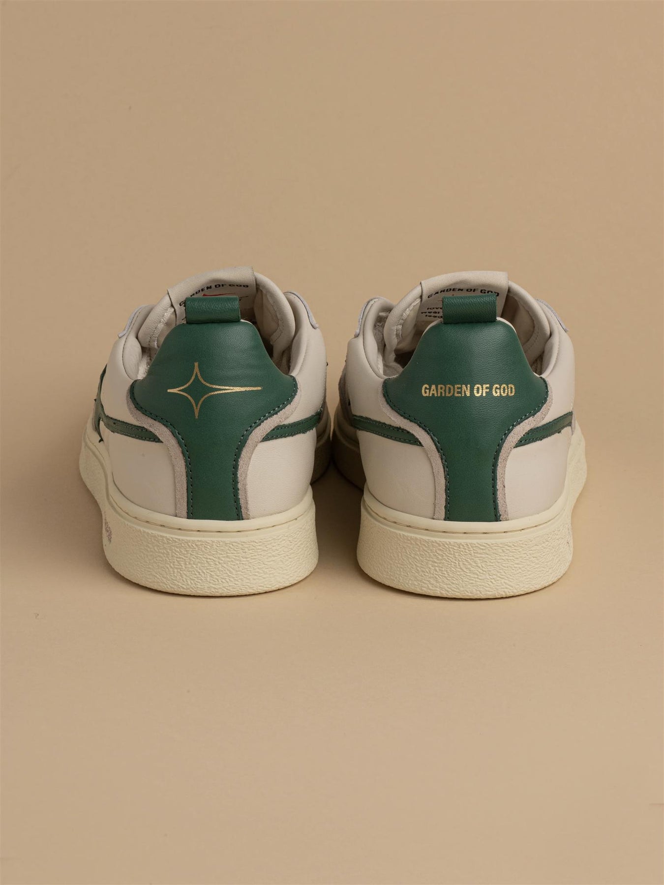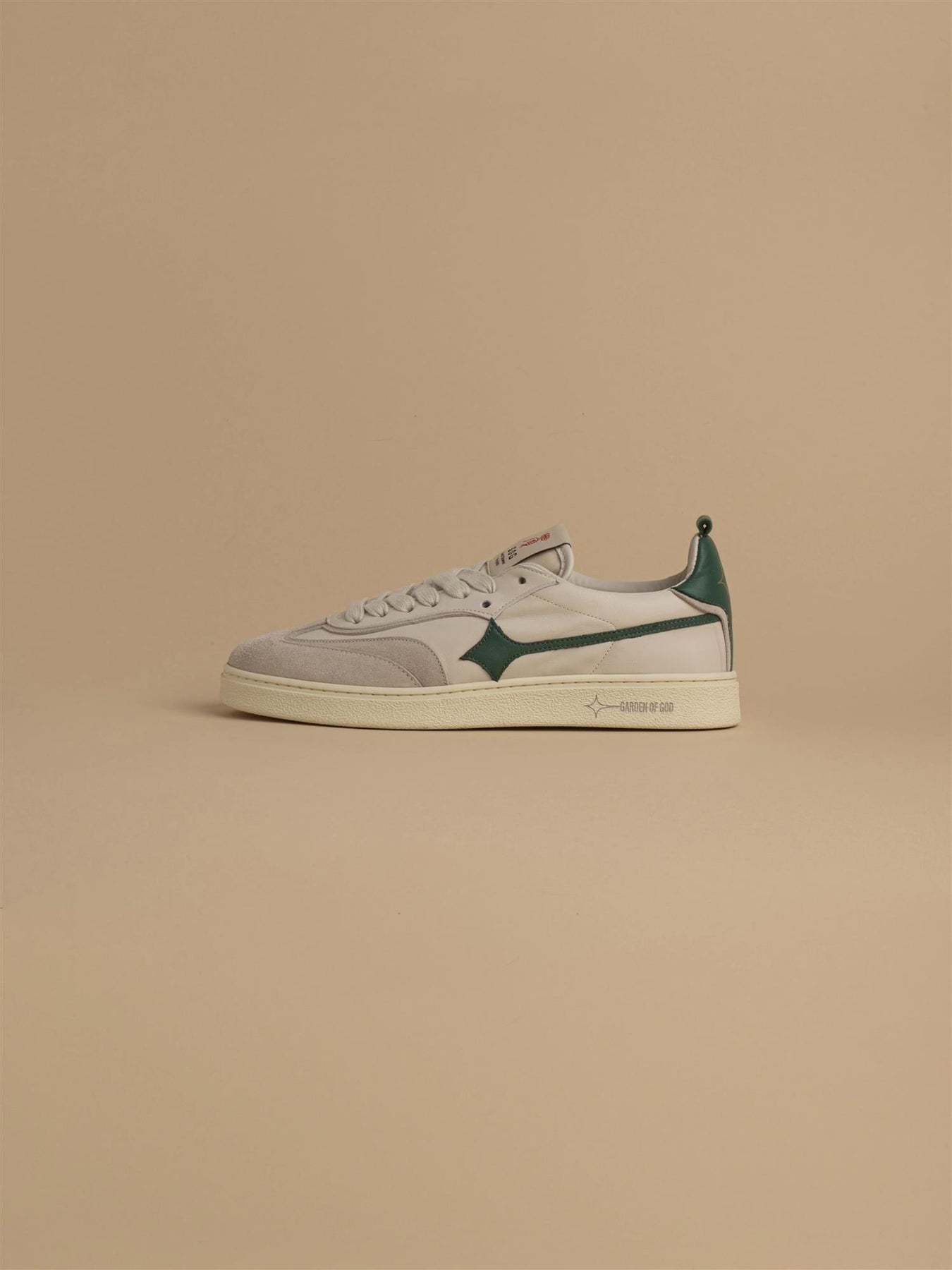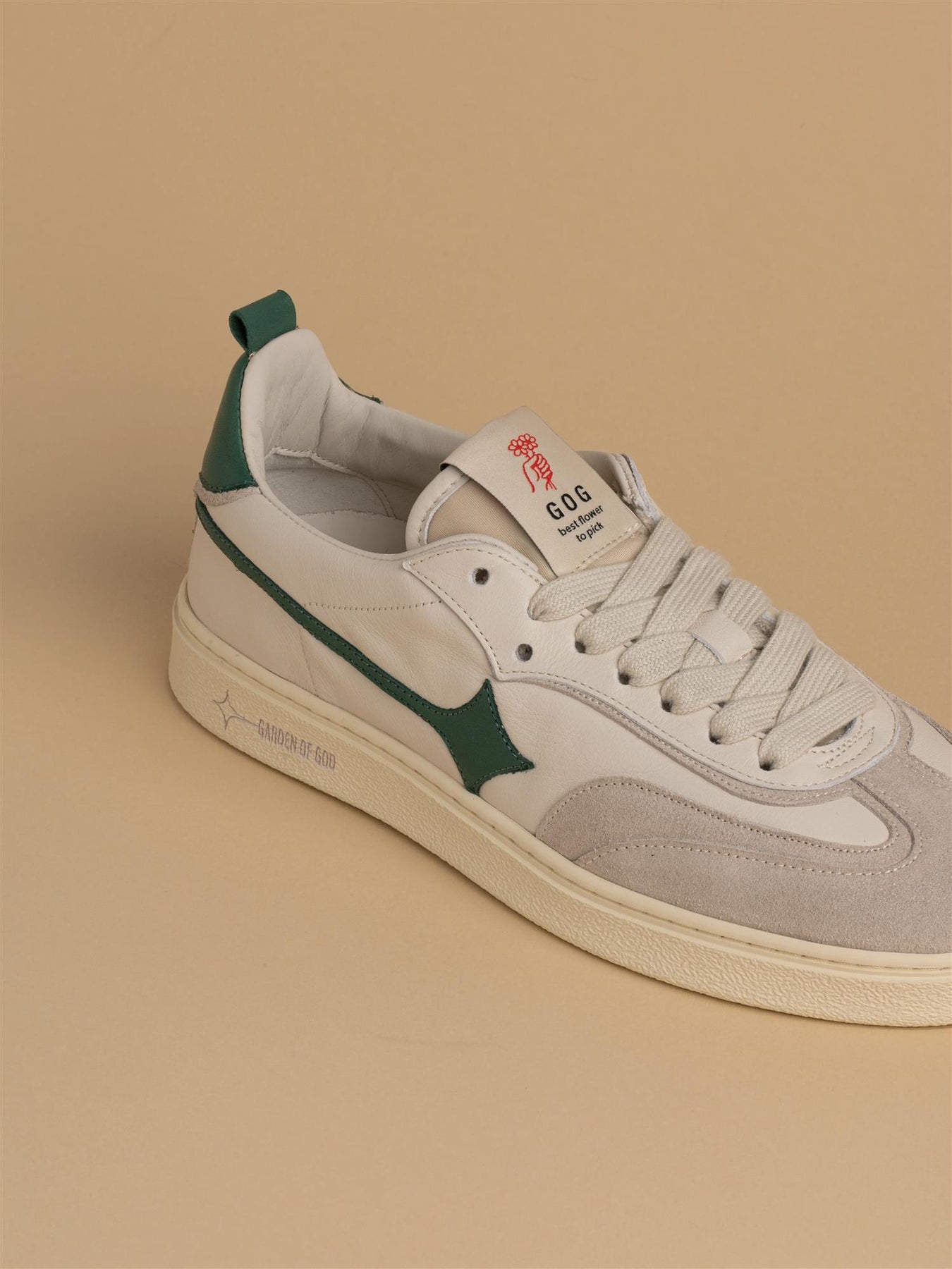 Stilig nyhet fra Garden of God. Denne kule skoen i off white med grønne detaljer kombinerer retrodesign med moderne detaljer og høy komfort. Skoen har grønn logo, skinndetaljer og to par med lisser i ulik farge.