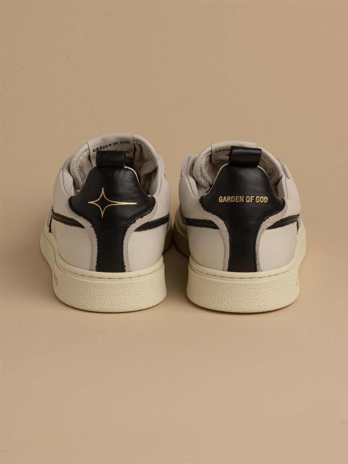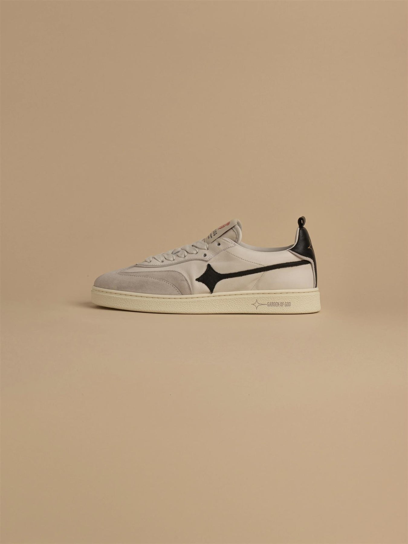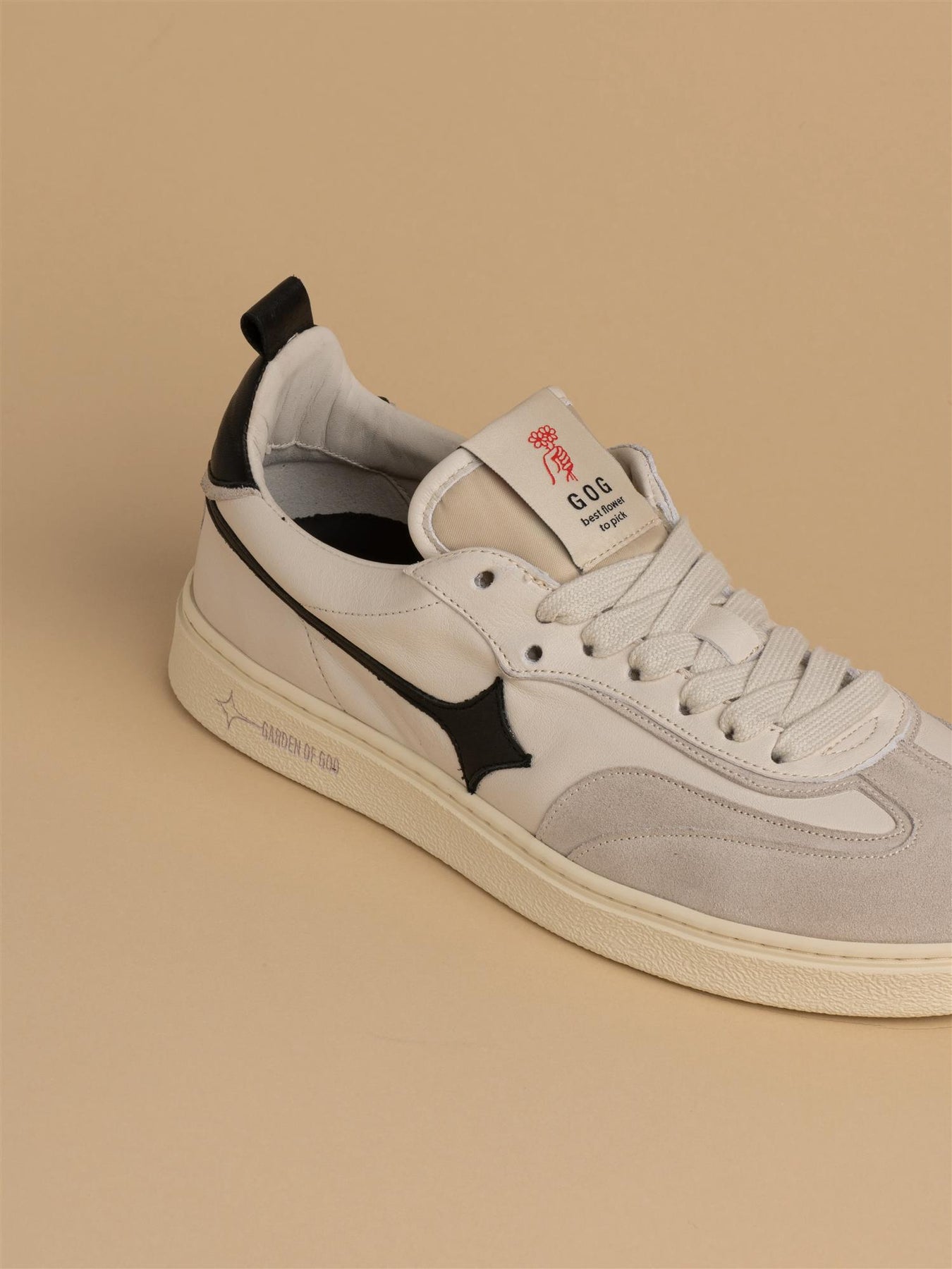 Stilig nyhet fra Garden of God. Denne kule skoen i off white med svarte detaljer kombinerer retrodesign med moderne detaljer og høy komfort. Skoen har svart logo, skinndetaljer og to par med lisser i ulik farge.