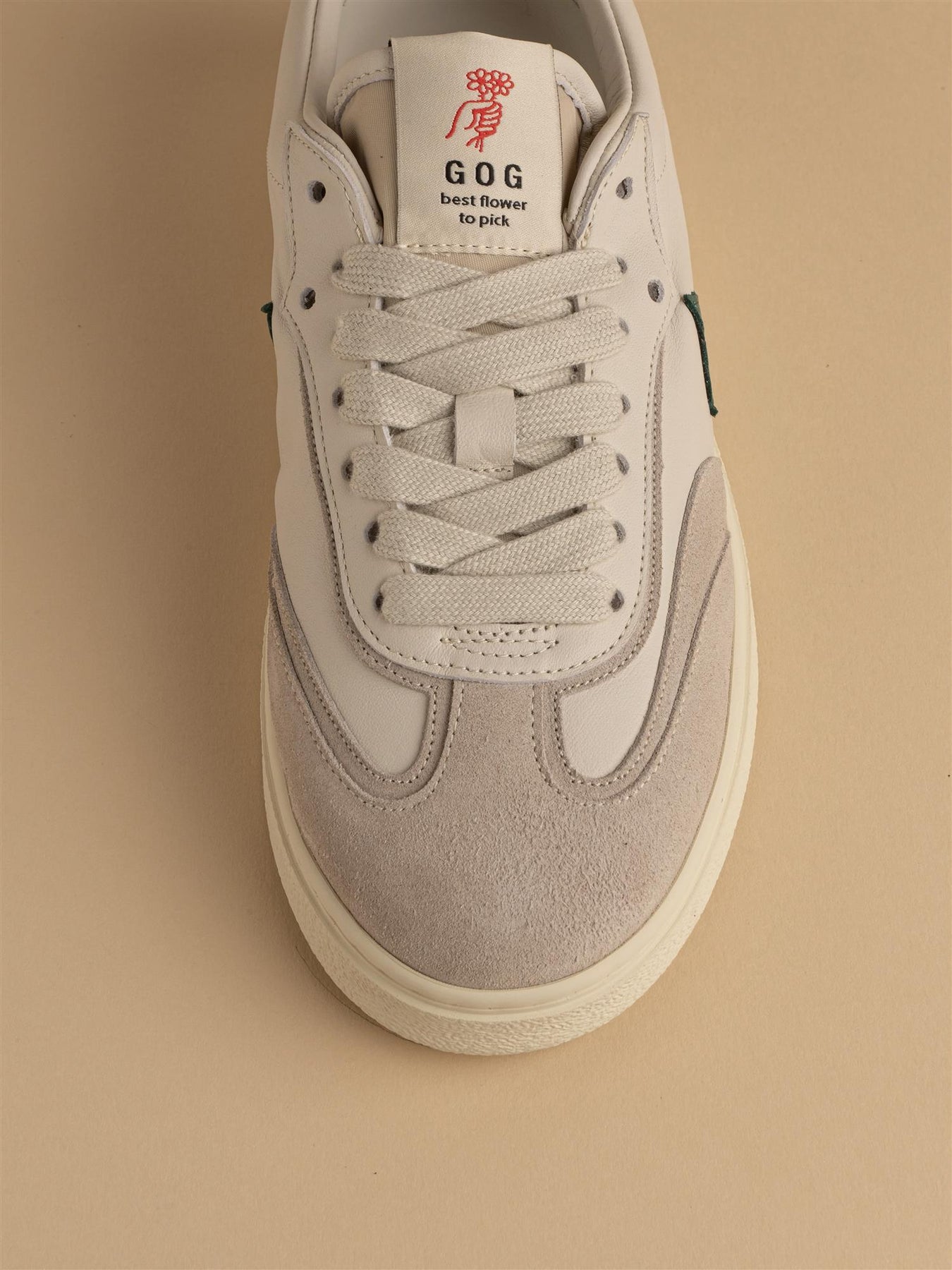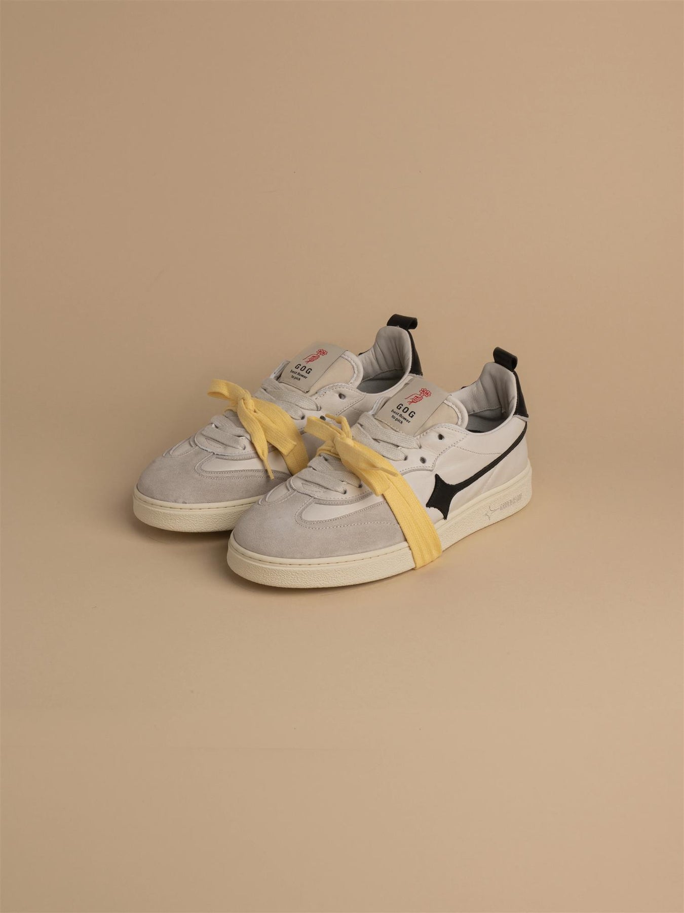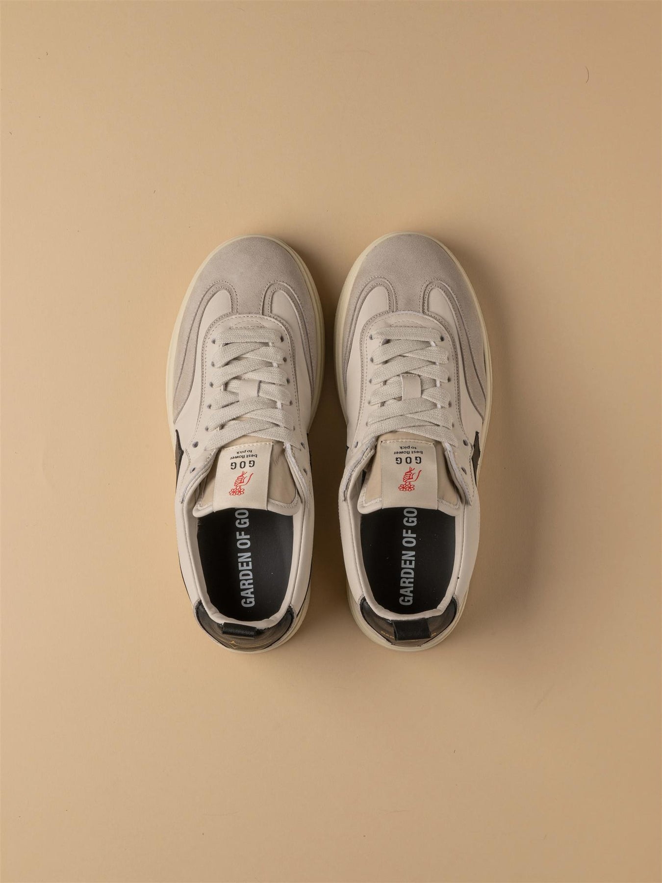 Stilig nyhet fra Garden of God. Denne kule skoen i off white med svarte detaljer kombinerer retrodesign med moderne detaljer og høy komfort. Skoen har svart logo, skinndetaljer og to par med lisser i ulik farge.