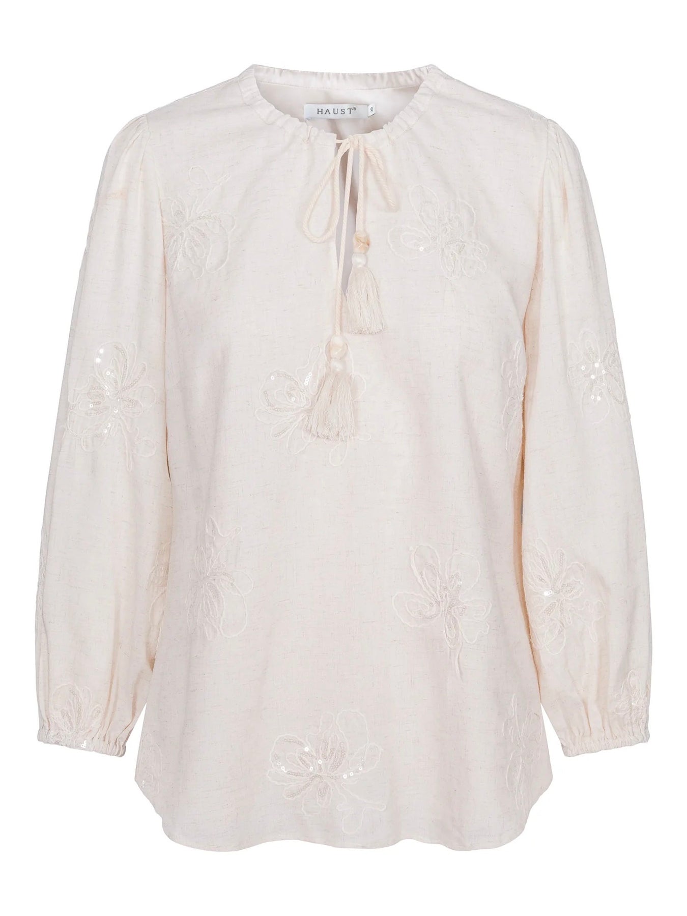 Fin bluse fra Haust med fine detaljer. En bluse som egner seg fint til både hverdag og fest. Blusen er laget i en lin og viskoseblanding som gjør at den føles ekstra myk på! Oppleves som normal i størrelsen.