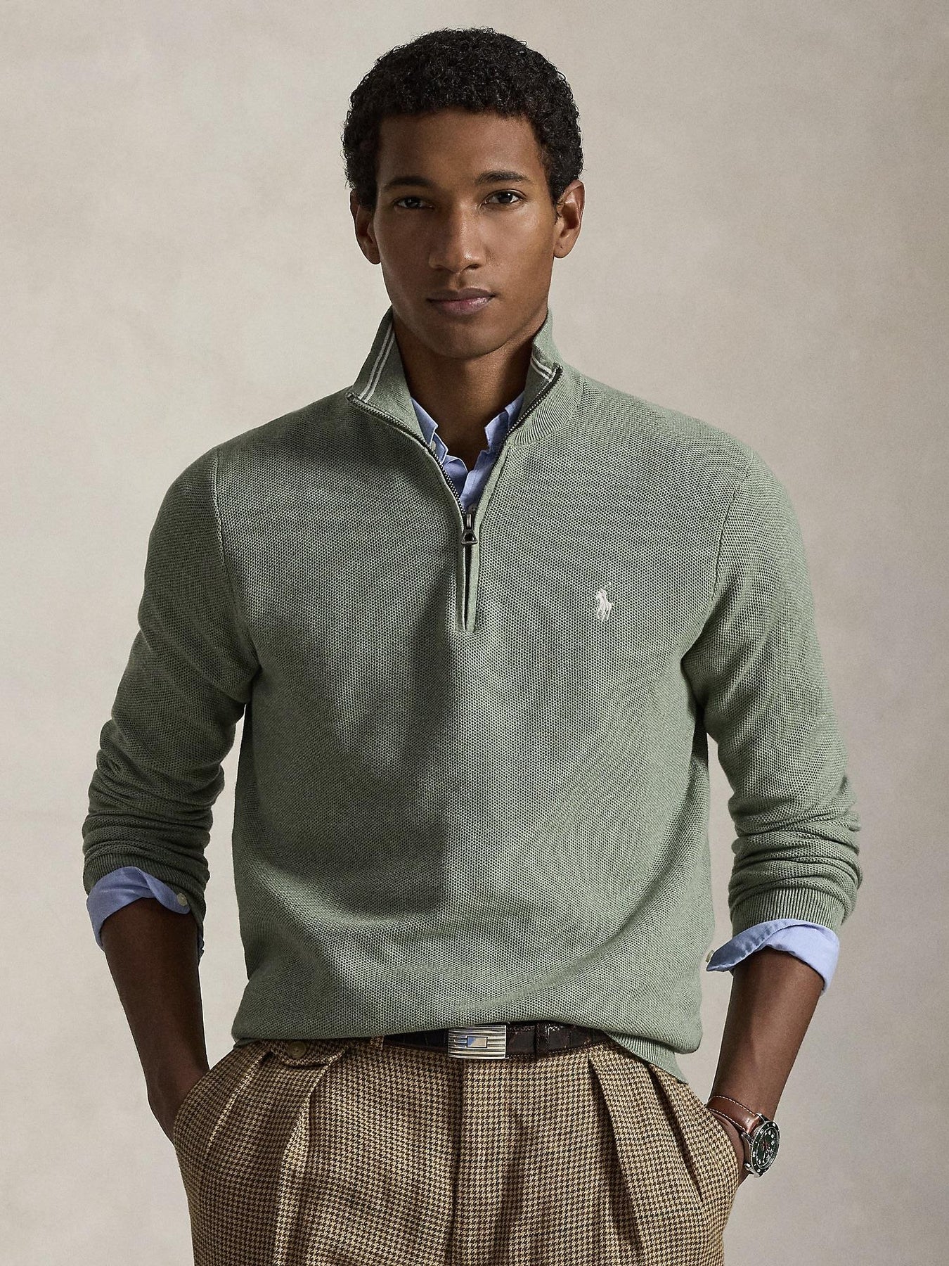 Favorittgenseren med quarter zip I en nydelig, grønn farge! Klassiske bomullsgenser med glidelås i halsen. En bestselger som hører hjemme i alle generasjoners klesskap. Den perfekte genseren å bruke alene eller over en skjorte. Modellen er 185 cm og har på seg str M.