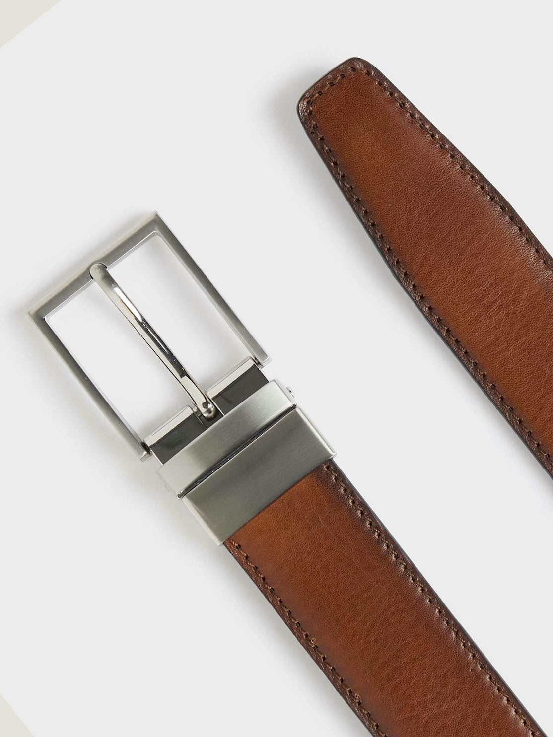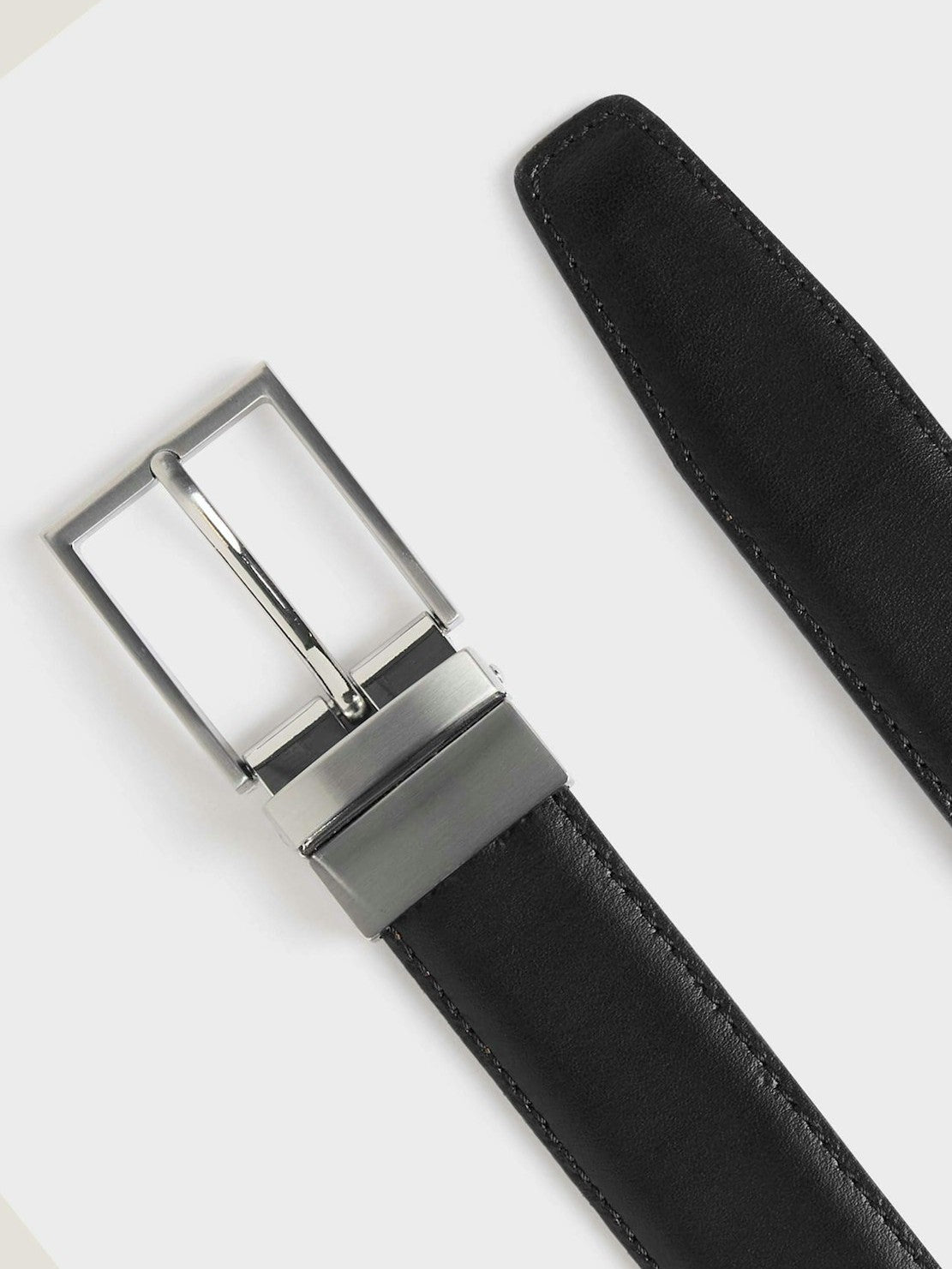 Vendbart skinnbelte i svart og brunt som gir to uttrykk i ett. Stilrent design med børstet sølvspenne, laget med fullnarvet skinn på den brune siden og slitesterkt splittskinn på den svarte. Skinn fra LWG-sertifisert garveri for høy kvalitet og ansvarlig produksjon.