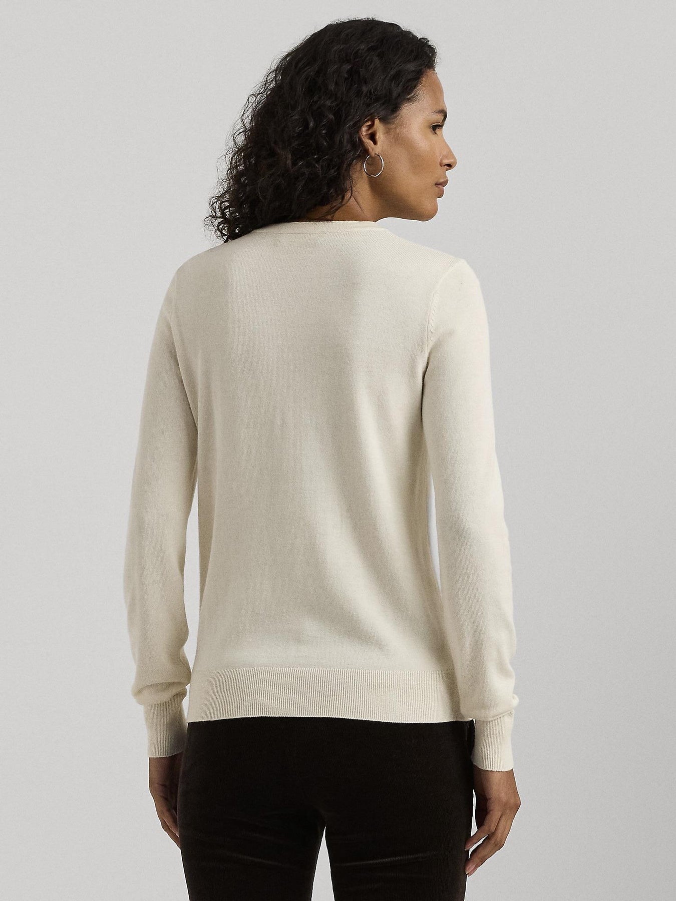 Kremfarget bomullsgenser fra Lauren. En enkel og fin genser som passer til alt. Genseren har en smal fasong og er ribbestrikket på ermene. Modellen er 178 cm og har på seg størrelse S.