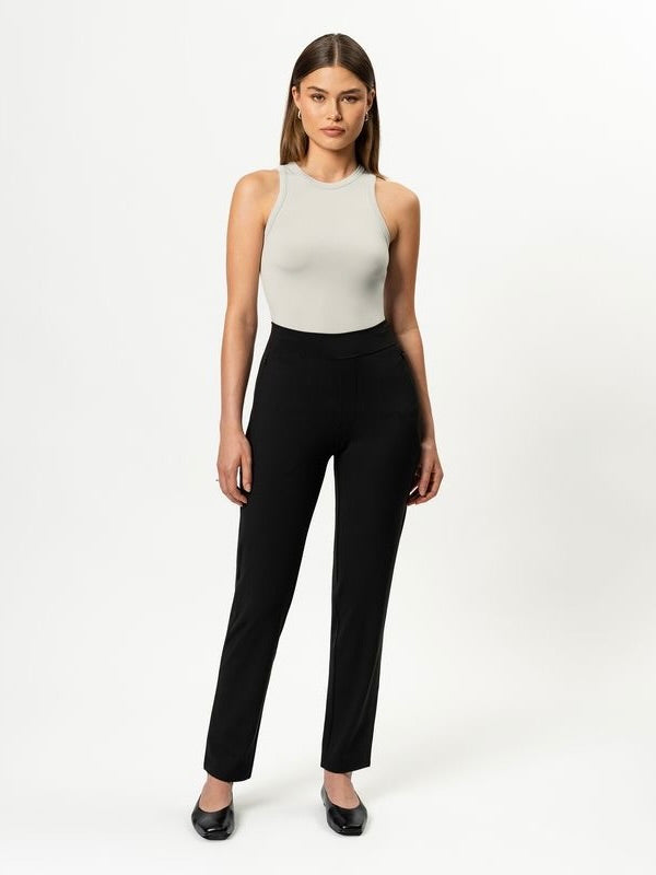 Den høye midjen og den myke, elastiske linningen gir støtte hele dagen uten å stramme. Stoffet er mykt, holder fasongen og er ikke gjennomsiktig. Skjulte glidelåslommer og en enkel gylfdetalj gir et rent og tidløst uttrykk.
