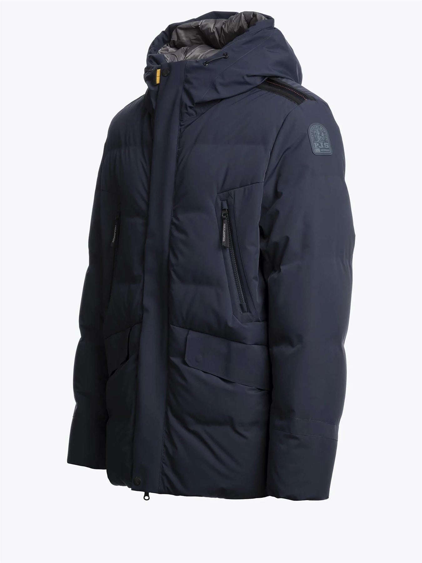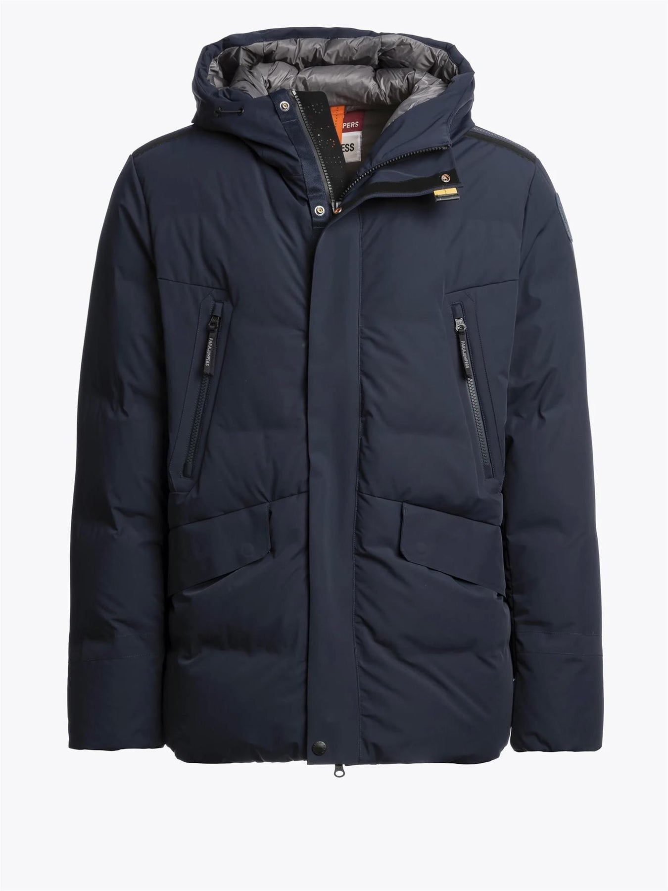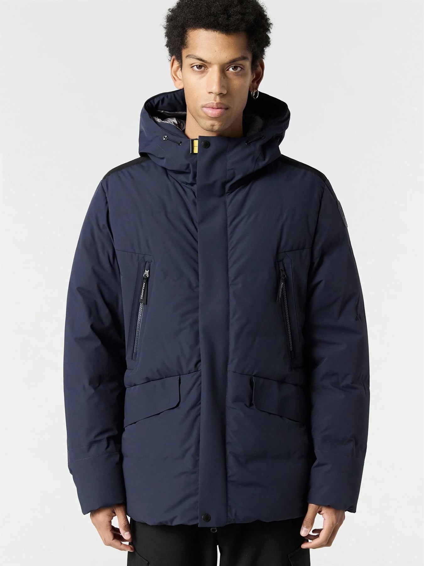 Kazu er en teknisk jakke fra Parajumpers. Funksjonell i trelags stretch med vannavvisende behandling. Fôret med resirkulert nylon og isolert med 90 % andedun og 10 % fjær for optimal varme. To-veis glidelås med knappet stormklaff, justerbar hette og nederkant, fire ytterlommer og en innerlomme. Elastiske mansjetter, silikonpatch på ermet og den ikoniske gule halsstroppen.