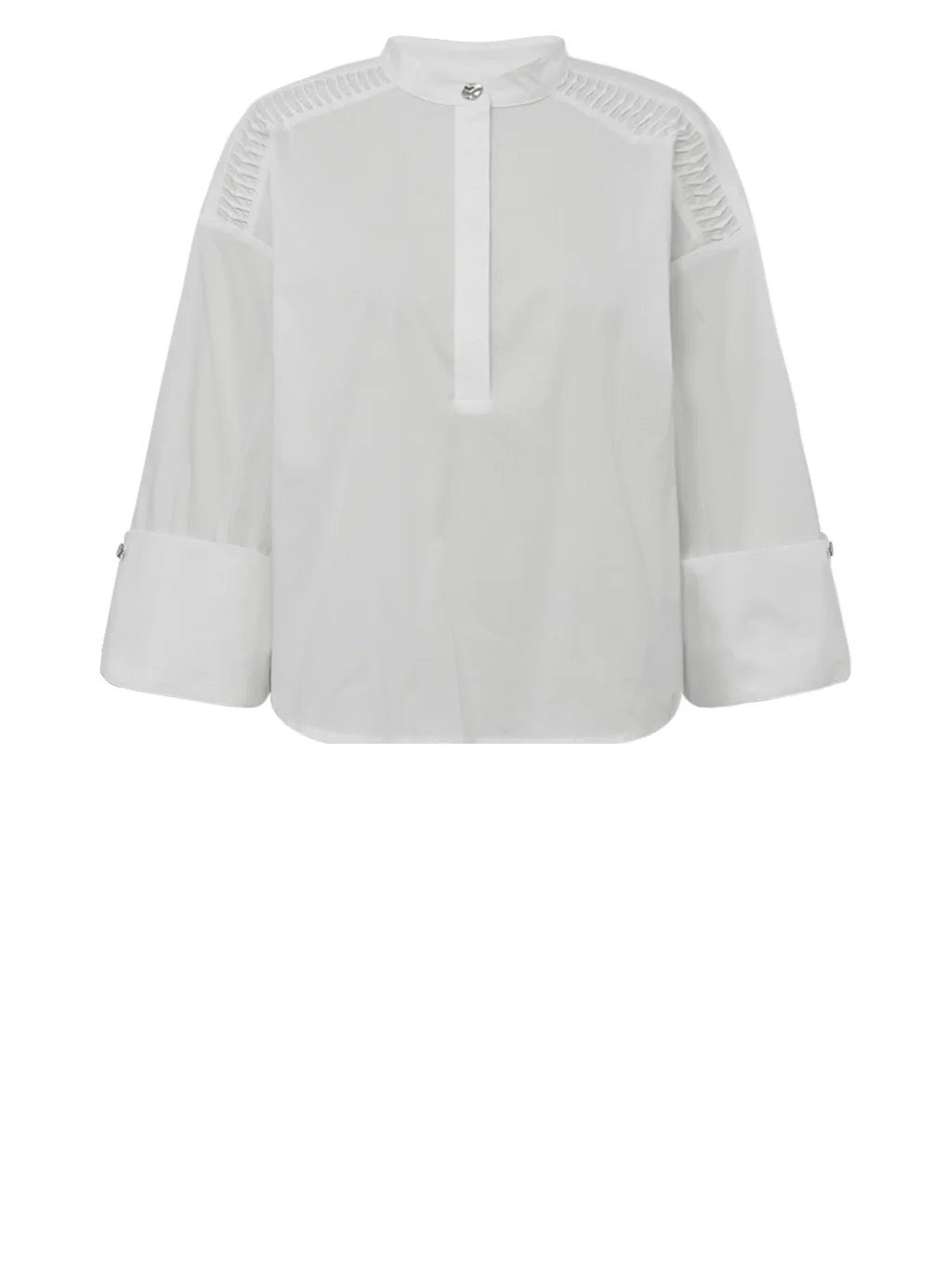 Delikat bluse med skulderdetaljer og brede mansjetter. Blusen har fine detaljer som sølvknapper. Kombiner med jeans og loafers for en avslappet look. Normal i størrelsen.
