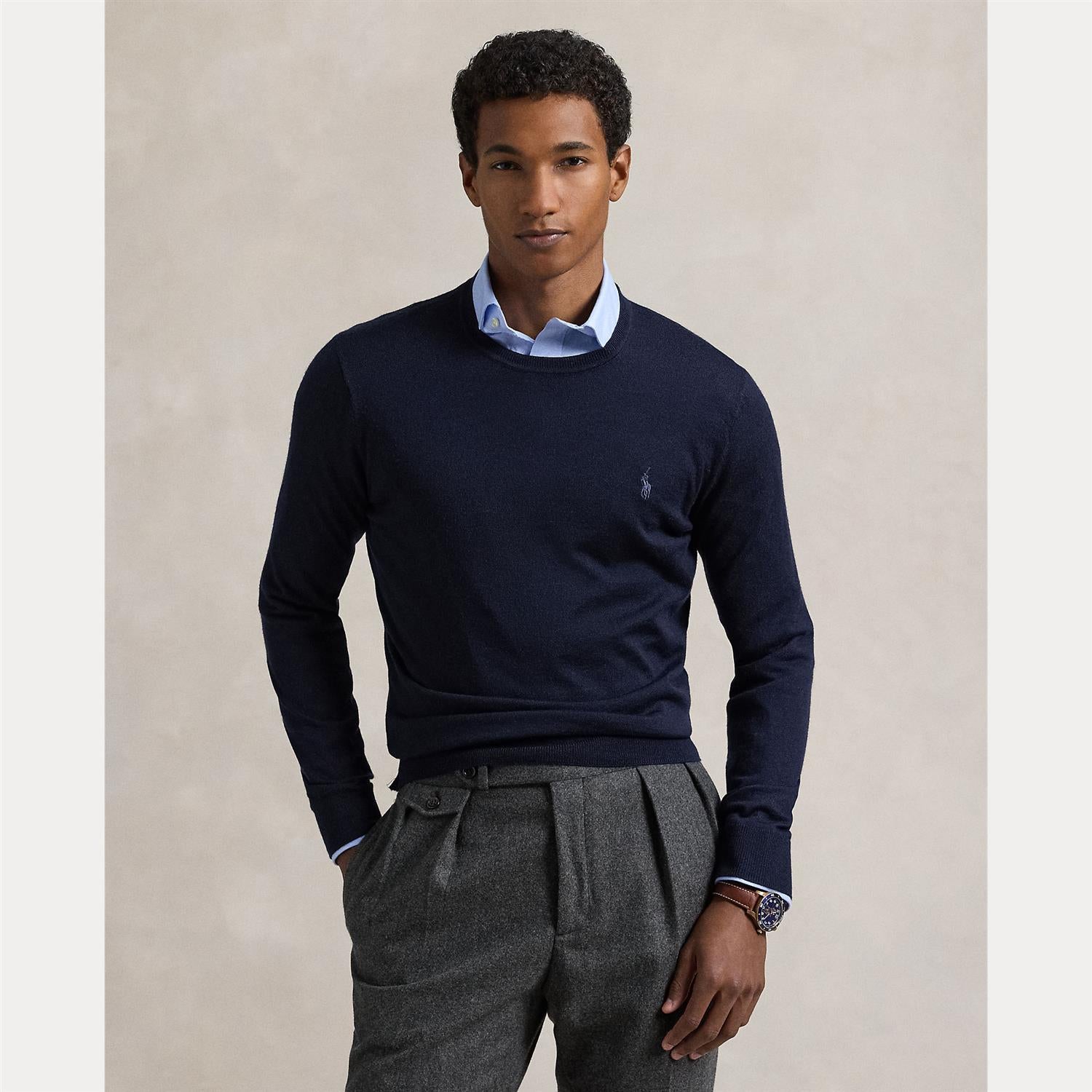 Klassisk og flott ullgenser fra Polo Ralph Lauren til herre i slim fit! Bruk den alene eller over skjorten. En flott genser i tynn og lett ullkvalitet som puster.