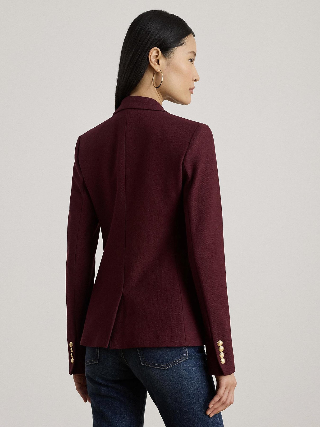 Elegant og tidløs blazer fra Ralph Lauren med stretch og feminin passform. Blazeren har to lommer i front, gullknapper og signatur logoen til Ralph Lauren på brystet. Den mørke burgunder fargen passer perfekt til en hvit skjorte og et par dressbukser!