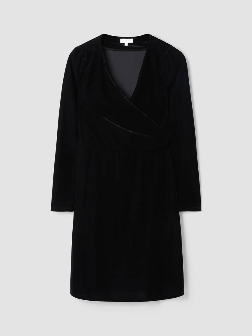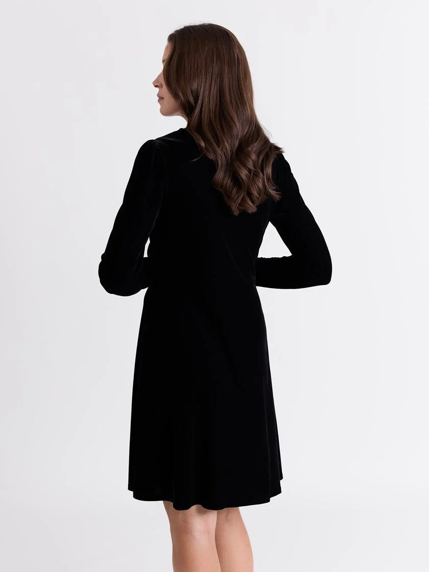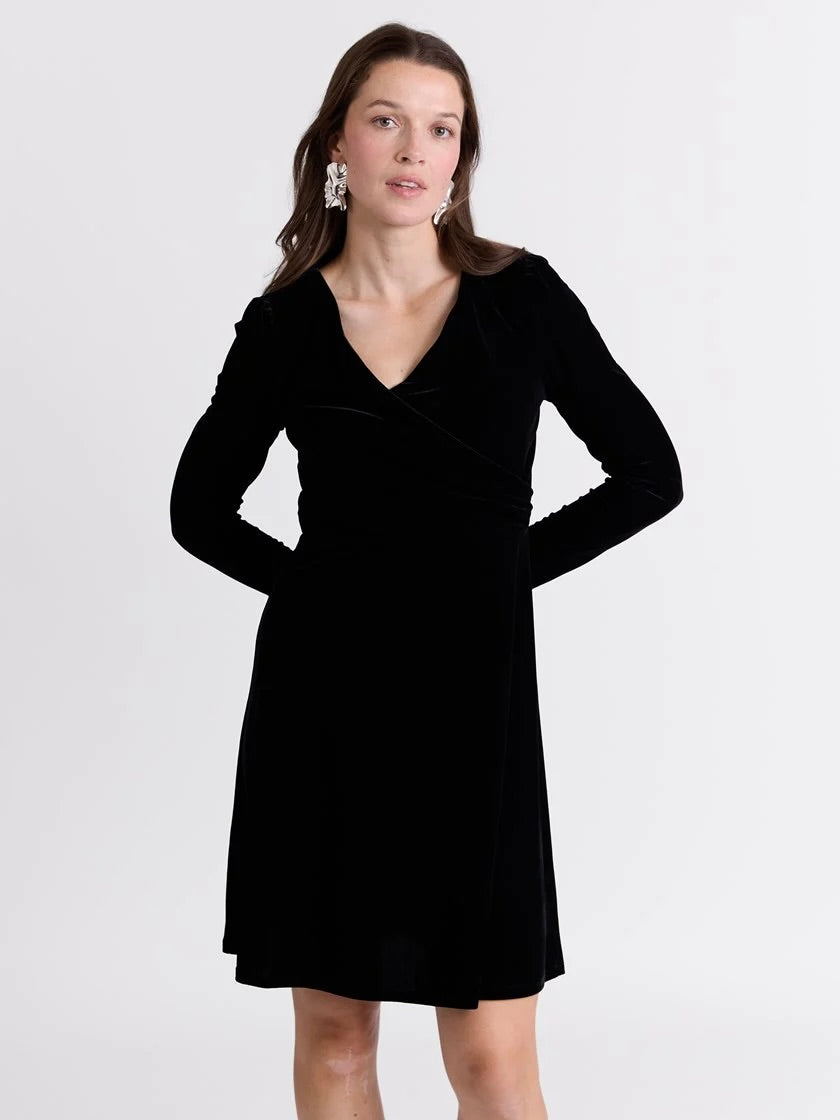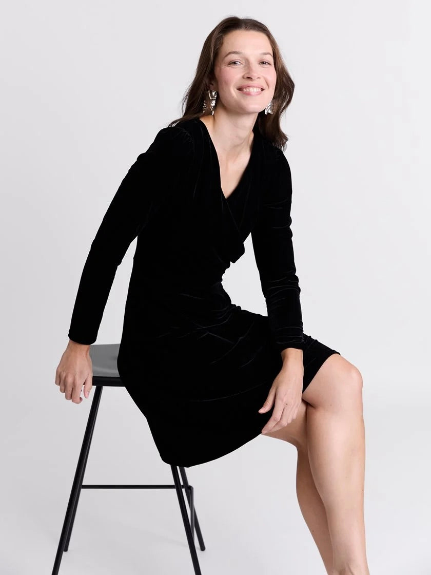 Flatterende velourkjole fra Va Vite. Kjolen har god stretch, lang erm med liten puff og en omslagsdel med drapering i front. En kjole som kan pyntes opp og ned.
