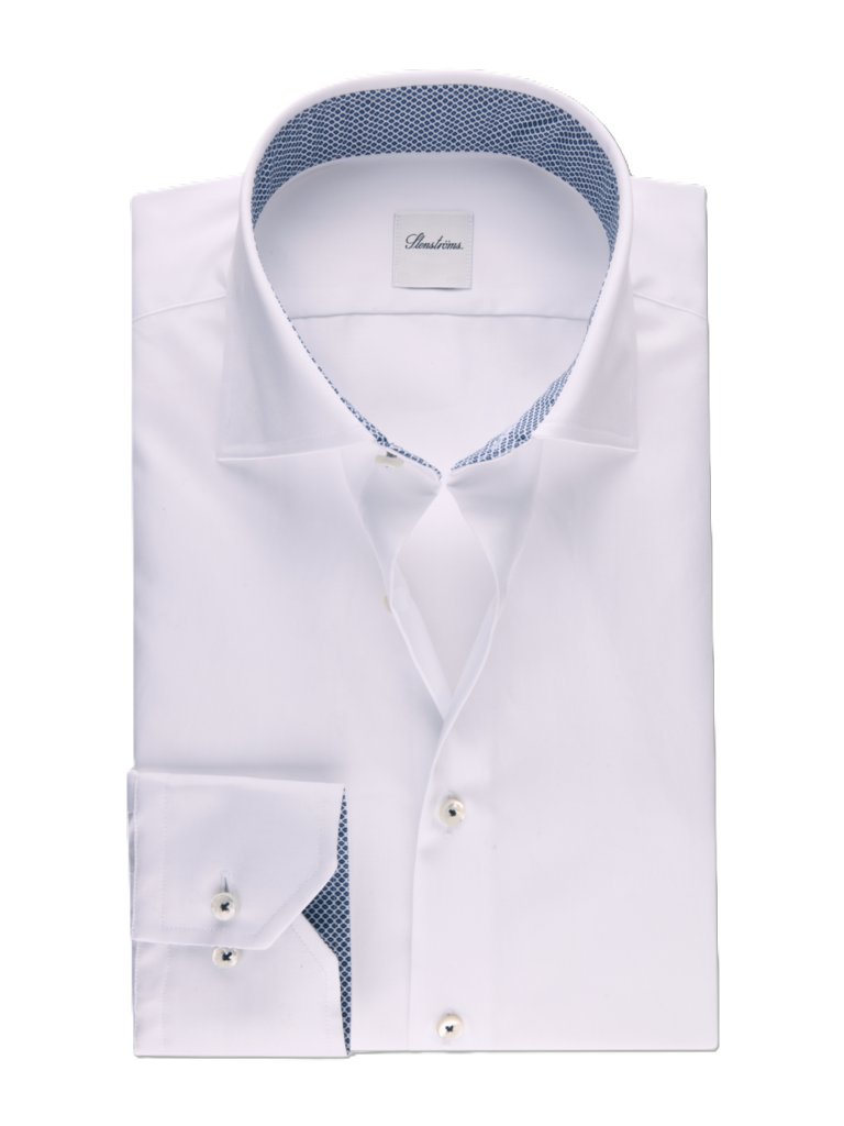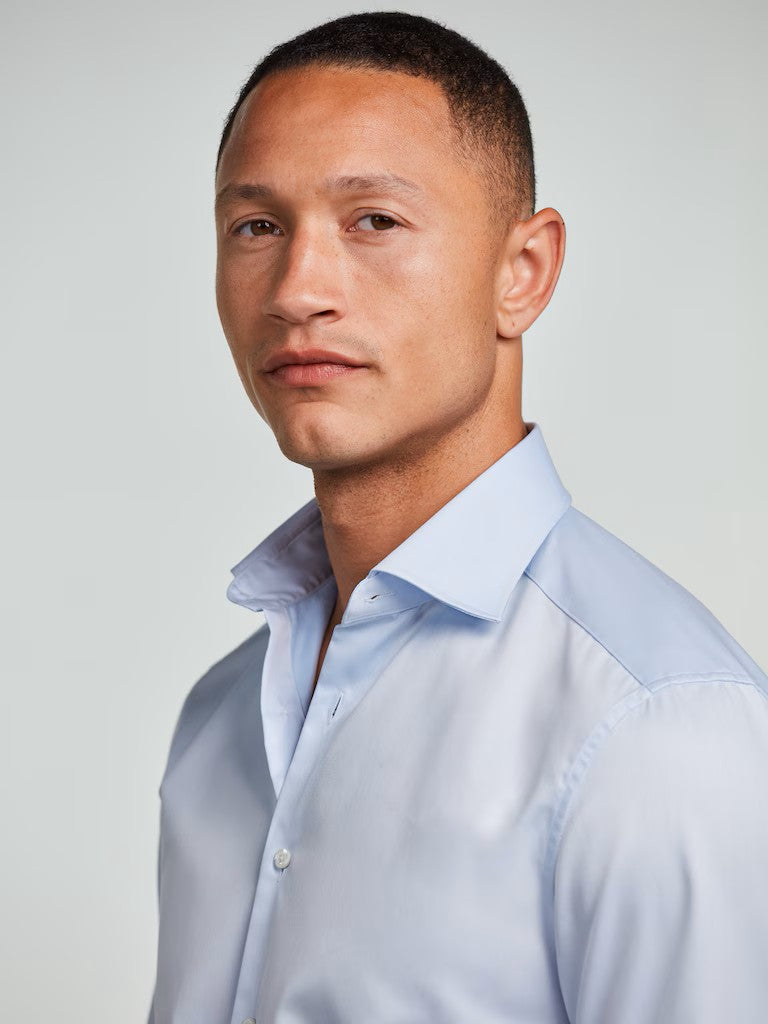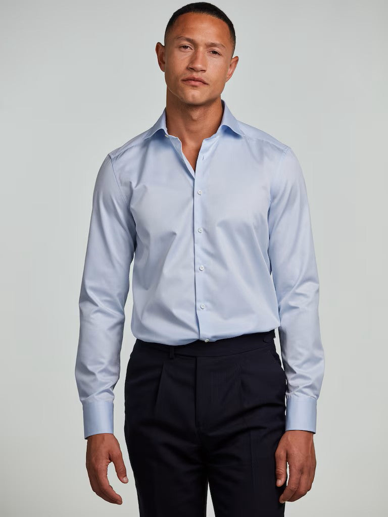 Denne twillskjorten i twofold bomull kombinerer tidløs eleganse med en raffinert kvalitetsfølelse. Den er vevd i superior twill som gir et mykt, smidig stoff med et eksklusivt fall, samtidig som den er slitesterk og behagelig å ha på. Skjorten har en moderate Cut Away‑krage (No. 77) som gir et moderne og rent uttrykk, enkel mansjett for et klassisk preg, og perlemorsknapper som tilfører en subtil luksusdetalj. Perfekt for både formelle anledninger og stilige hverdagsantrekk.