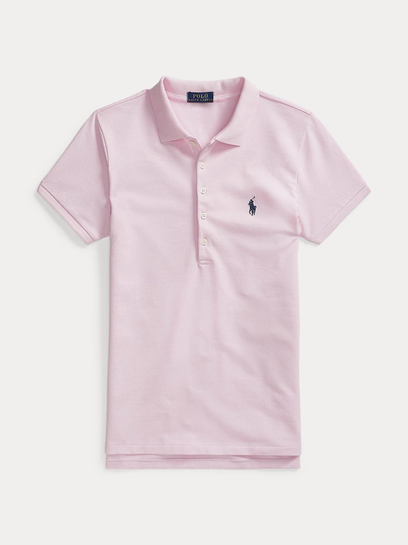 Polo slim fit pique i en nydelig rosa farge. Piquen har fem-knapps lukking, korte ermer og ribbestrikket krage.