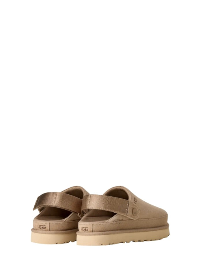 Goldenstar Clog i Sand! En anvendelig platform sko i semsket skinn med hælstropp og en ultralett såle. Normal i str, vil gå litt ut da det er skinn.
