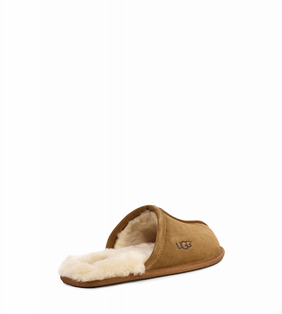 Brune tøfler fra UGG. Myk tøffel og behagelig fôr innvendig. Tøffelen har semsket skinn og yttersålen er formstøpt i gummi. Oppleves som normale i størrelsen.