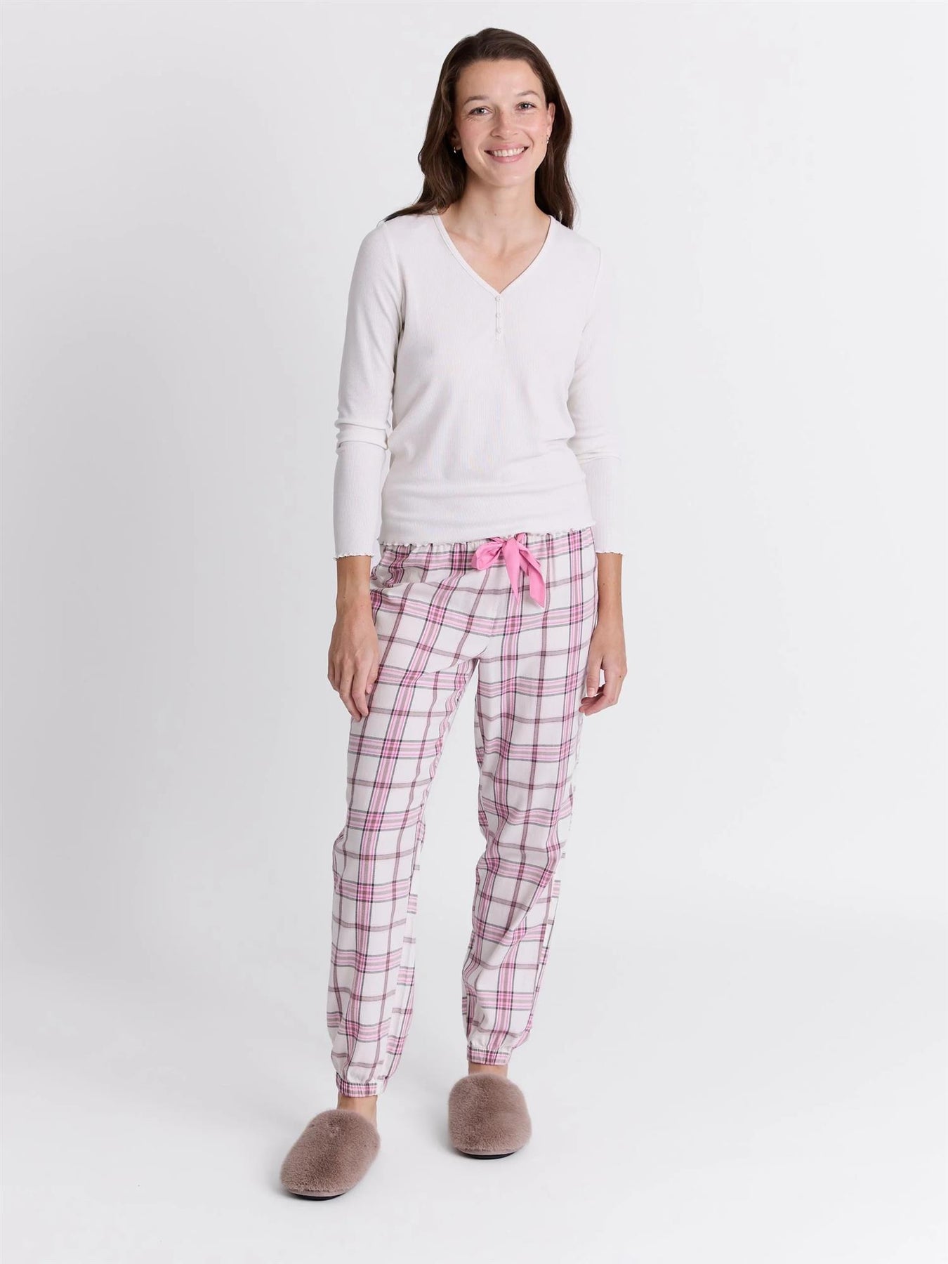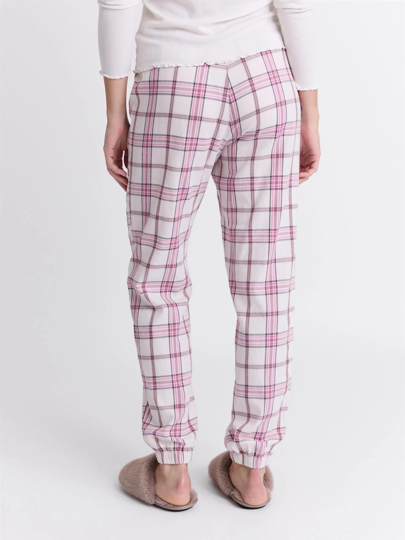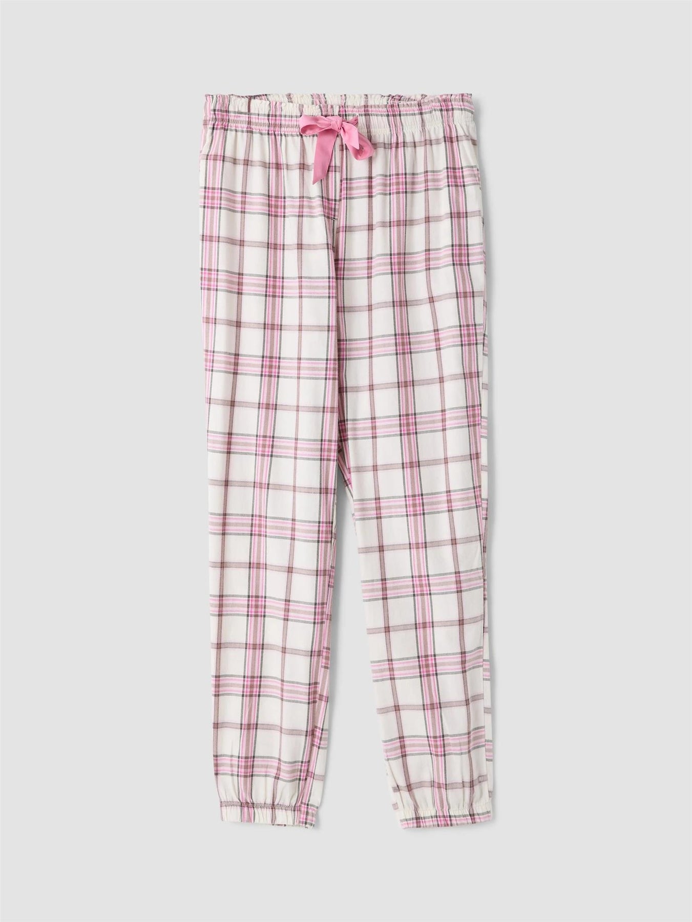 Rutet pysjbukse med elastikk og satengbånd i livet. Denne pysjbuksen er laget av 100% børstet bomull, som gjør den ekstra myk og behagelig. Den har et klassisk rutemønster i rosa toner og et satengbånd som gir en feminin detalj. Rette ben med elastikk nederst sørger for en god og komfortabel passform.