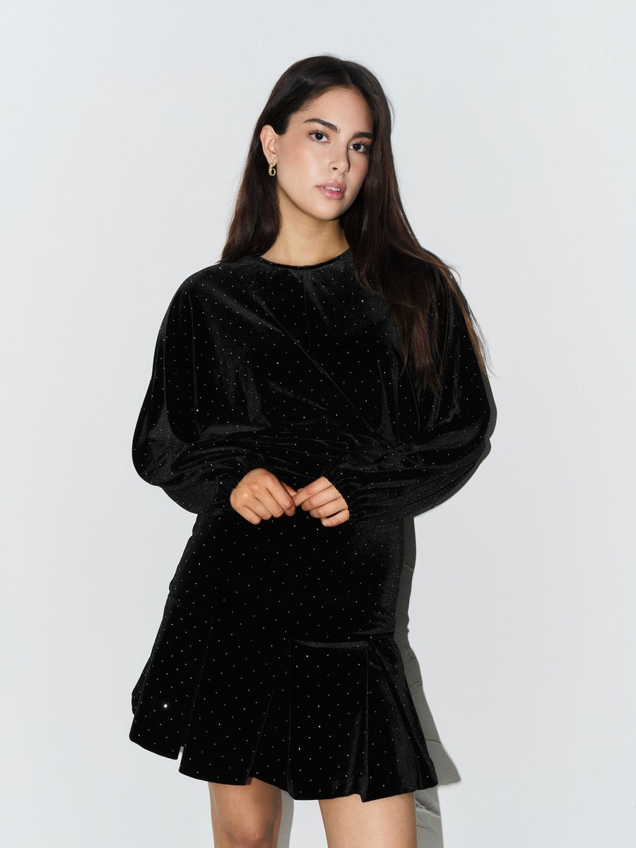 Kjolen har en klassisk rund hals, lange puffede ermer og en stivet, plissert panel nederst som gir bevegelse og struktur til silhuetten. Med glidelås bak i ryggen er den enkel å ta av og på. Dette er en perfekt kjole for sesongens fester, middagsselskaper eller når du vil føle deg ekstra fin – en leken blanding av eleganse og attitude.