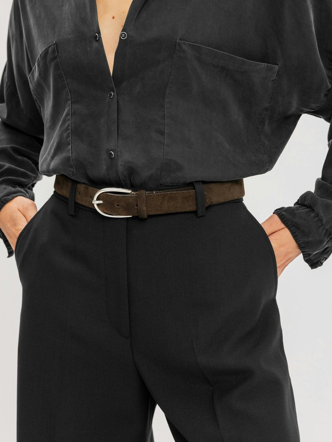 Et stilfullt damebelte som løfter antrekket ditt. Perfekt å bruke i buksens linning eller sammen med dressbukser. Beltet er laget i Italia av semsket skinn med en myk og luksuriøs finish. Det er lett preget og prydet med en vakker, avrundet spenne i antikk sølvfarget metall. Skinnet er av høyeste kvalitet og har blitt behandlet i et garveri sertifisert av Leather Working Group.