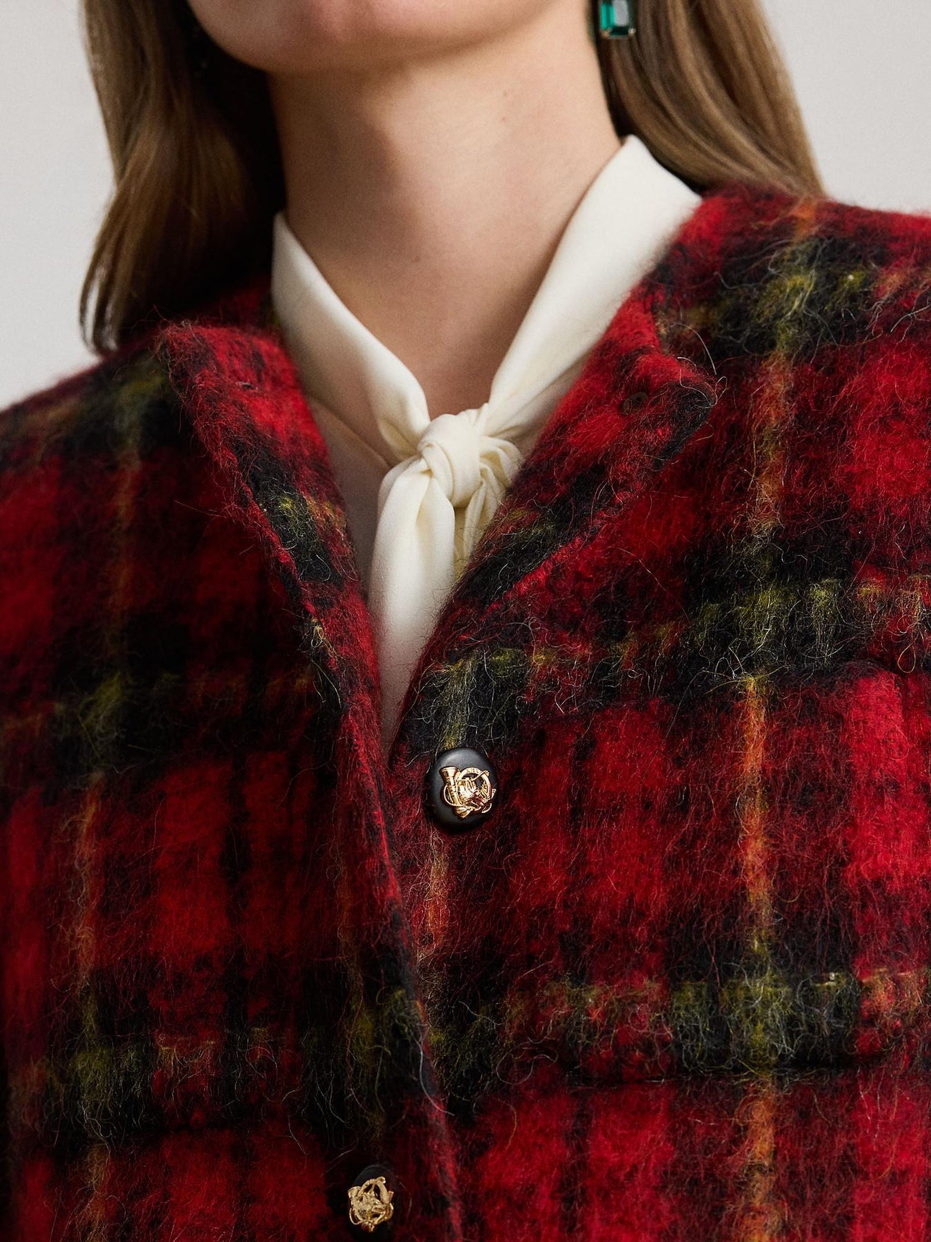 Gi antrekket ditt et sofistikert preg med denne vintage-inspirerte cropped jakken, laget av eksklusivt italiensk mohair. Jakken er garnfarget med sesongens elegante rutemønster, og de unike knappene med revemotiv gir et luksuriøst og raffinert uttrykk.